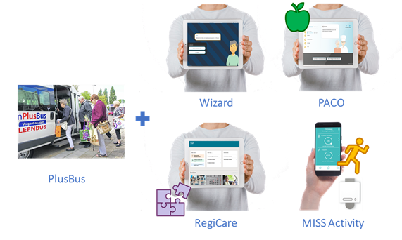 The services of the PlusBus are being extended with a set of integrated technologies. These technologies are: Regicare message pages for activities of the PlusBus (AdSysCo); PACO an virtual eating and cooking coach (RRD); MISS Activity, a monitoring tool for physical activity (Maastricht Instruments). They can all be accessed from the RegiCare customer portal (AdSysCo). Moreover, the use of these technologies starts with the wizard (RRD), also on this portal. In the wizard, conversational agent Robin helps the user get started.